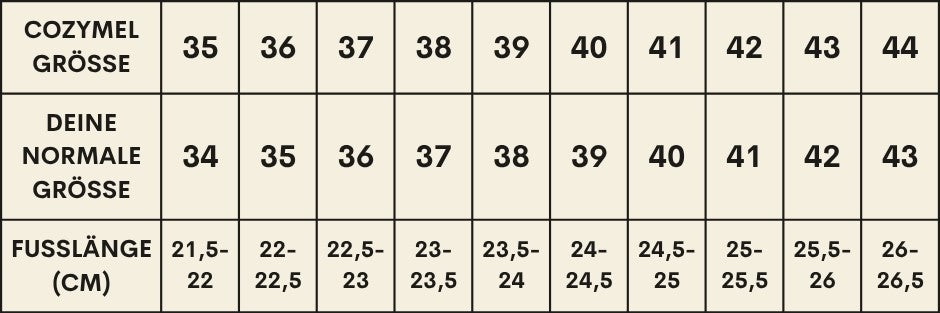 Unsere Cozymel Sneaker fallen eine Größe kleiner aus! Das heißt, wenn du normalerweise Größe 40 trägst, solltest du dir die Cozymel Sneaker in Größe 41 holen. Falls du zwischen zwei Größen bist, z.B. 40,5 empfehlen wir dir die noch größere Größe 42 zu holen.